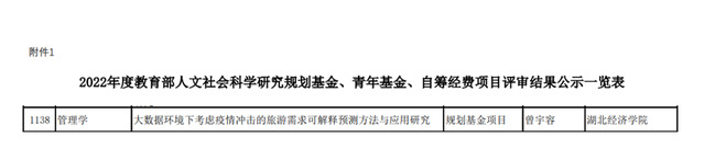 7月29日,2022年度教育部人文社会科学研究一般项目评审结果公布,亚博官网曾宇容老师主持申报的《大数据环境下考虑疫情冲击的旅游需求可解释预测方法与应用研究》获教育部人文社会科学研究规划基金项目立项。